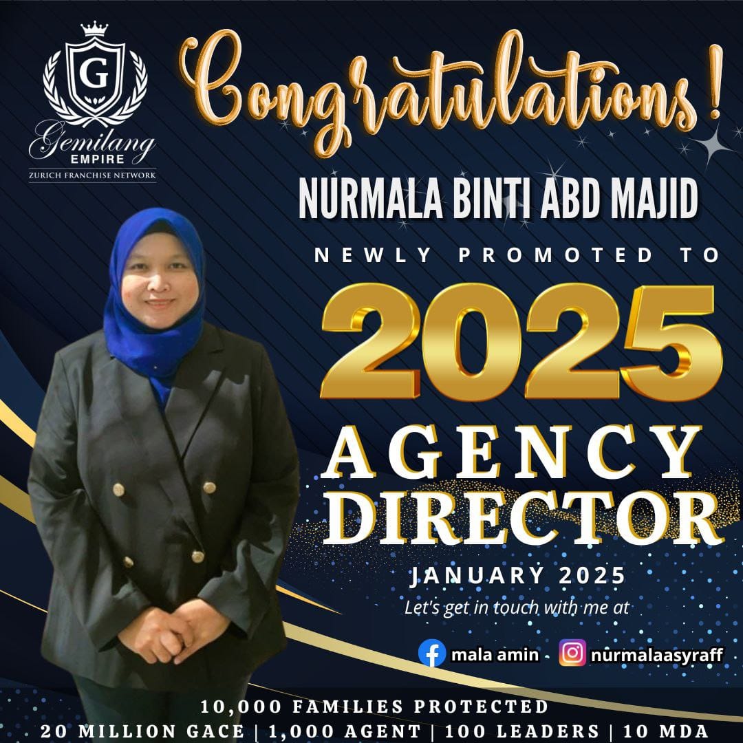 Pada 1 Januari 2025, saya dilantik sebagai Agency Director selepas berjaya membantu lebih 50 ketua keluarga memiliki pelan perlindungan takaful. Misi saya mudah β memastikan lebih ramai rakyat Malaysia mempunyai perlindungan patuh Syariah dan mampu milik.